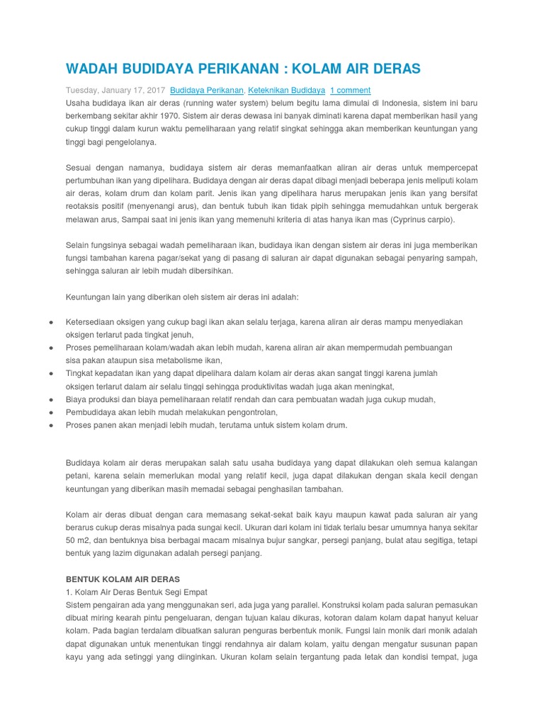 Keunggulan kolam air deras. Pertama kalinya tekonologi kolam sistem air deras ini diperkenalkan di indonesia pada awal tahun. Kolam air deras merupakan tempat pembesaran ikan yang airnya mengalir secara terus menerus. Ketinggian air untuk kolam air deras yang digunakan untuk usaha perikanan sebaiknya kurang dari 800 meter di atas permukaan laut. Toni kuswoyo 16 092 views.